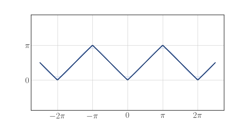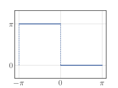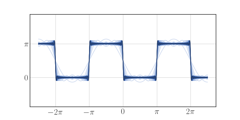 接下来看一个示例,将方波 \\( \displaystyle f(x) = \begin{cases} \pi & x \in \lbrack -\pi, 0 \rbracp \\ 0 & x \in \lbrack 0, \pi \rbracp \end{cases} \\) 展开为傅里叶级数: