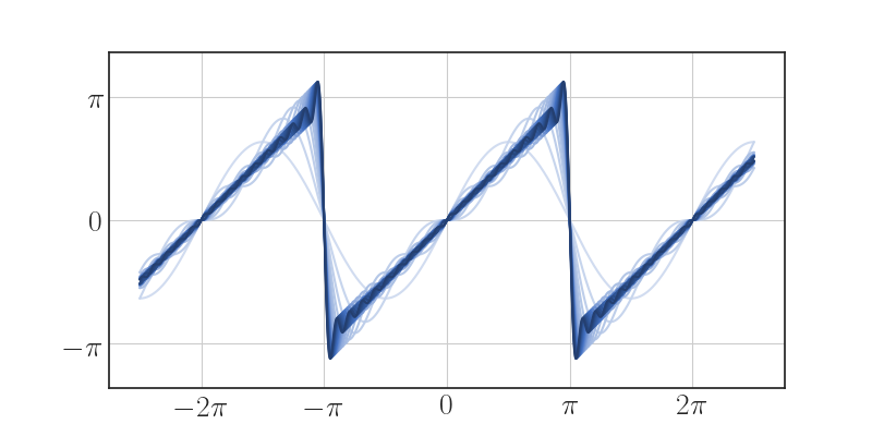 这样的函数甚至不连续,因此根本无法使用泰勒展开式。接下来看看使用傅里叶级数的展开效果。