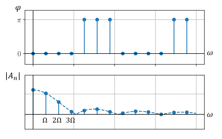 由此可画出频谱图如下:(当 \\( A_n \\) 为负时,可以认为是相移 \\( \pi \\) 的结果)