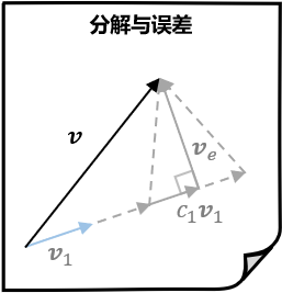 这里倾向于使用正交分解的一个特点是:正交分解具有最小的误差,如果仅将向量 \\( \Vec v \\) 分解为 \\( \Vec v_1 \\) 方向上的分量,为了使另一个分量(这里称为误差分量)\\( \Vec v_e \\) 长度最小,那么就需要使 \\( \Vec v_1 \\) 与 \\( \Vec v_e \\) 正交: